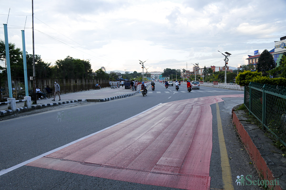 संविधान दिवसको दिन उद्घाटन गर्ने गरी सडक विभागले रातो रङ पोतेर छुट्टै लेन बनाइरहेको छ।