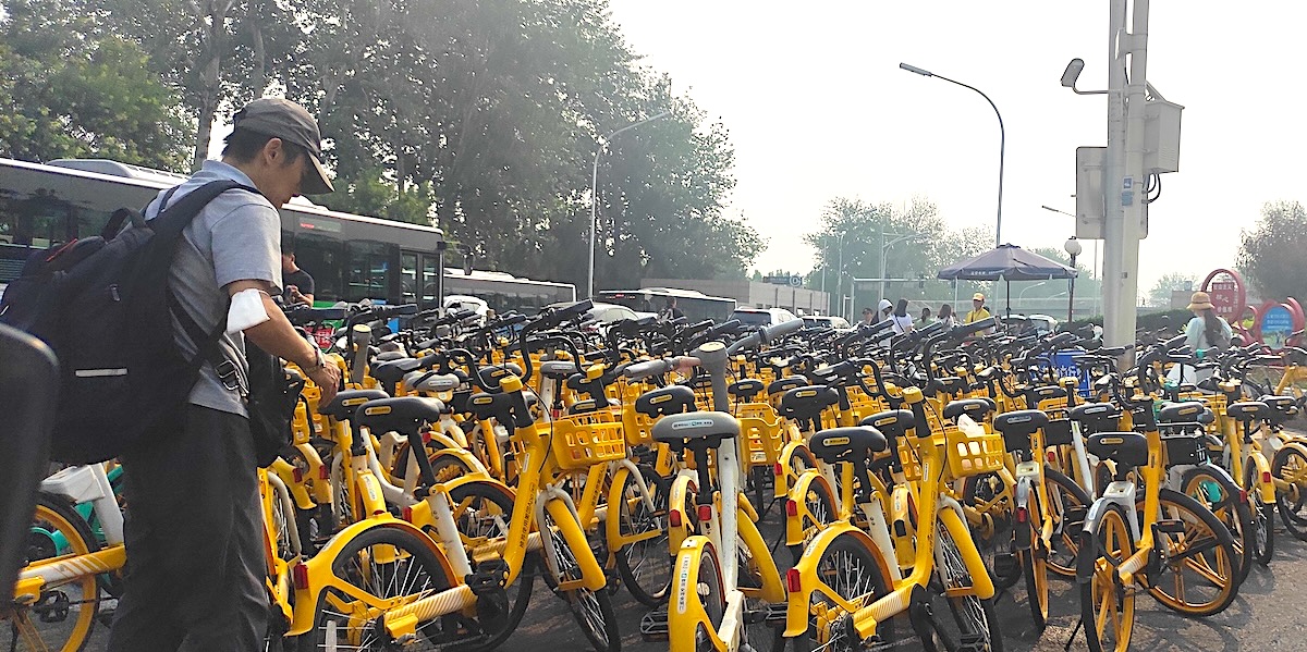 बेइजिङ मोबाइक टेक्नोलोजीको 'मैथुआन', शाङहाई हेल्लो फुखुई टेक्नोलोजीको 'हारो' र क्वाङ्रचौ छिआन टेक्नोलोजीको 'तिती छिनछिउ' साइकलहरू फरक फरक रङमा सडकपेटीमा राखिएका देखिन्छन्।