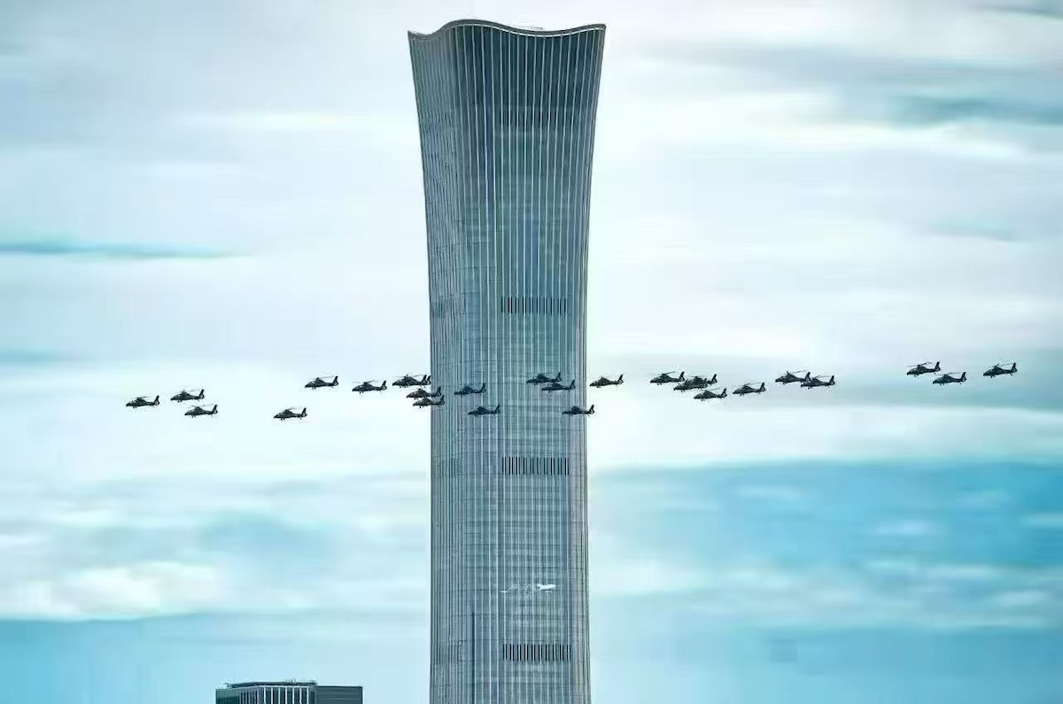 सैन्य परेडमा बेइजिङको आकाश युद्धक विमानले भरिएको थियो। विमानहरूले आकाशमै अंग्रेजी अंकहरू आठ र शून्य बनाएर ८० औं वार्षिकोत्सवको प्रतिबिम्ब सिर्जना गरेका थिए।