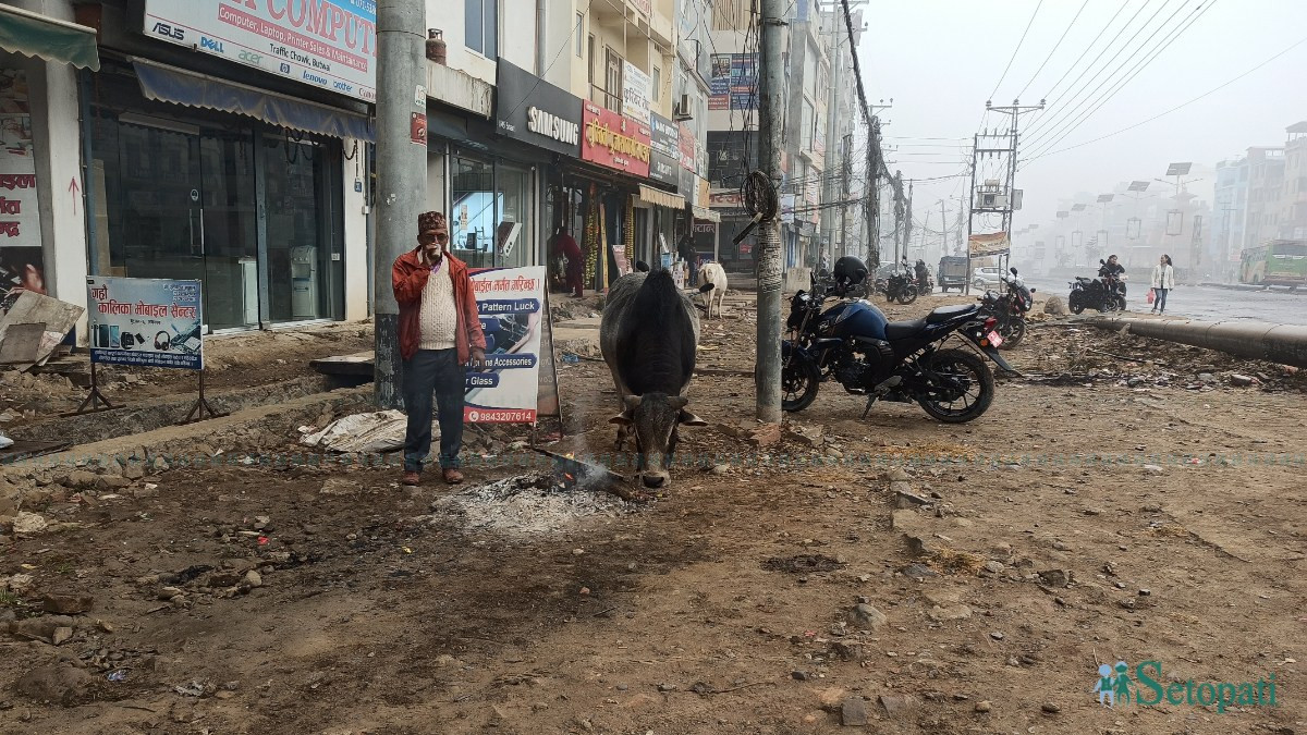 शीतलहर र कुहिरोबाट गाईवस्तु सुरक्षित राख्न न्यानोपनका लागि स्थानीय कृषकहरूले जुटको बोरा, पुराना कपडा जनावरको शरीरमा कोटको रूपमा प्रयोग गरेको देखिन्छ।