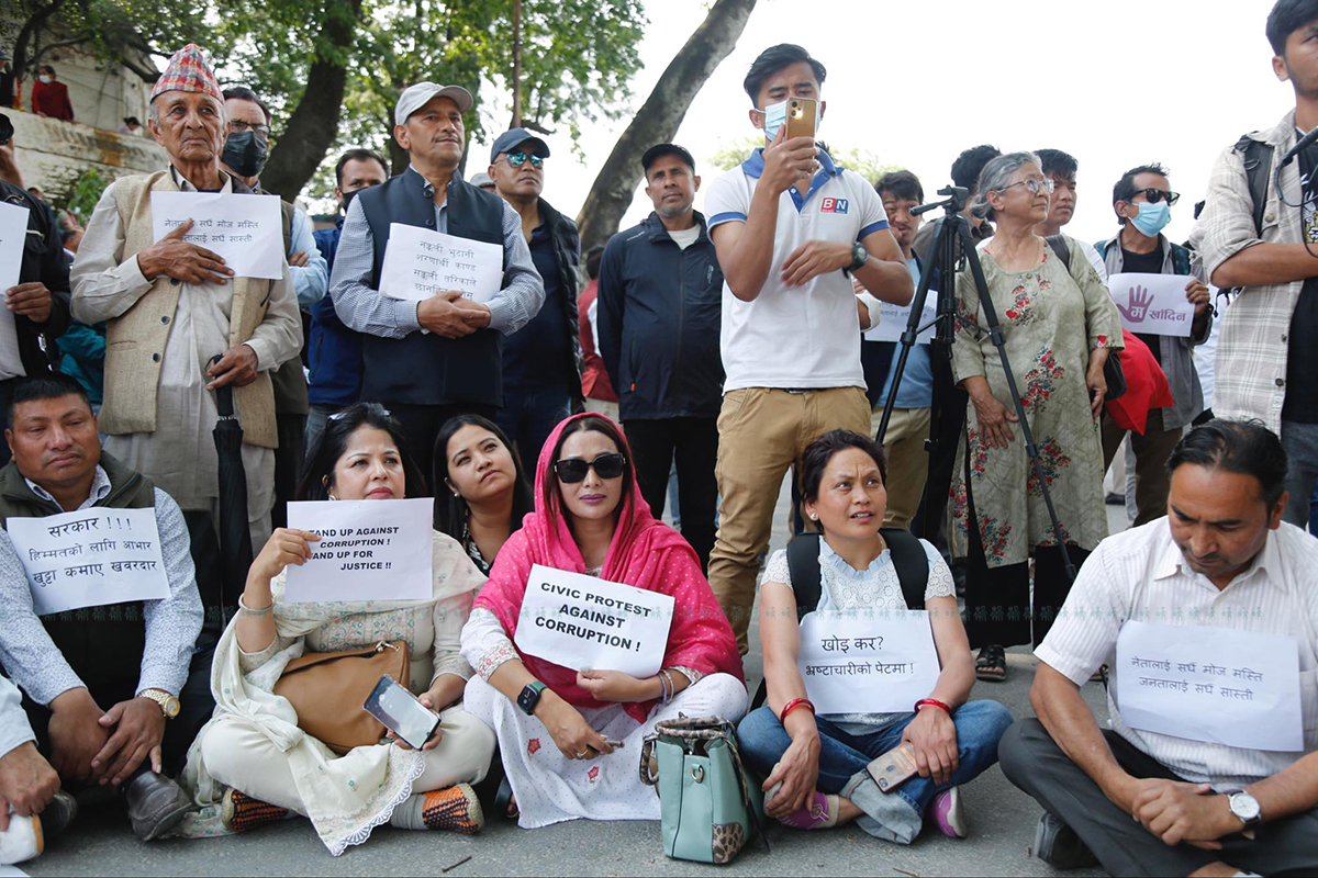 प्रदर्शनमा सहभागीहरूले ‘नक्कली भुटानी शरणार्थीको काण्डको सक्कली छानबिन होस्, खोई कर, भ्रष्टाचारको पेटमा, मानव तस्करीको दश हात, टोपबहादुरलाई ओलीको साथ’ लगायत नारा लेखिएका प्लेकार्ड बोकेका थिए।