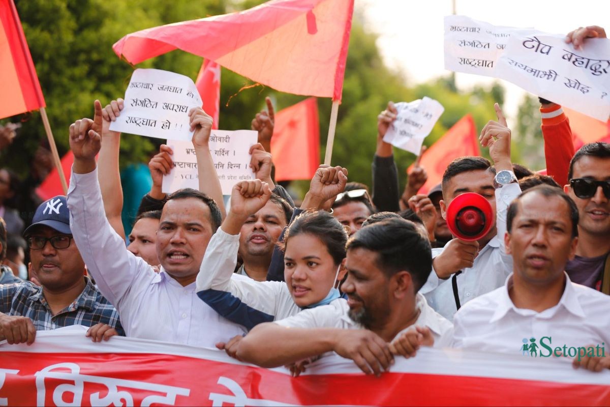नक्कली भुटानी शरणार्थीसहित विभिन्न भ्रष्टाचार काण्डमा मुछिएका सबै दोषीहरूलाई कारबाही गर्न माग गर्दै प्रदर्शन गरेका हुन्।