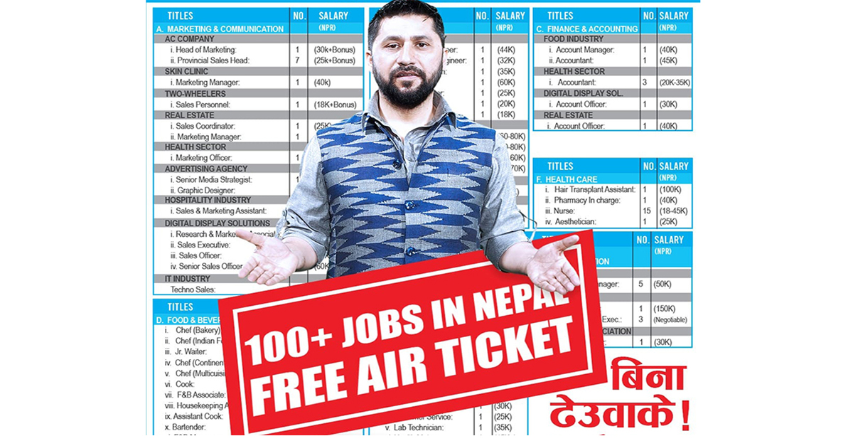 उनको राखेको विज्ञापनमा 'जब अपर्च्युनिटी फर नेपाली सिटिजन इन नेपाल' लेखिएको छ। एकातिर नेपालको नक्सा र अर्कातिर नेपालको झन्डा राखिएको छ।