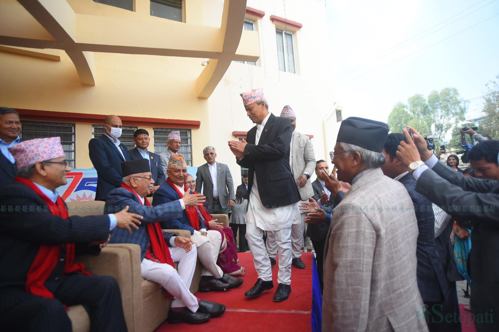 शीर्षस्थ नेताको स्वागतमा ओली आफैं खटिएका थिए। एमालेले पार्टीका नेता-कार्यकर्ता, शुभेच्छुक र आमनागरिकका लागि दिउँसो साढे १२ बजेदेखि चियापान खुला गरेको थियो। शीर्ष नेताहरूलाई दुई बजेको निम्ता थियो। त्यसपछि कूटनीतिक नियोग प्रमुख लगायतलाई समय निर्धारण गरिएको थियो।