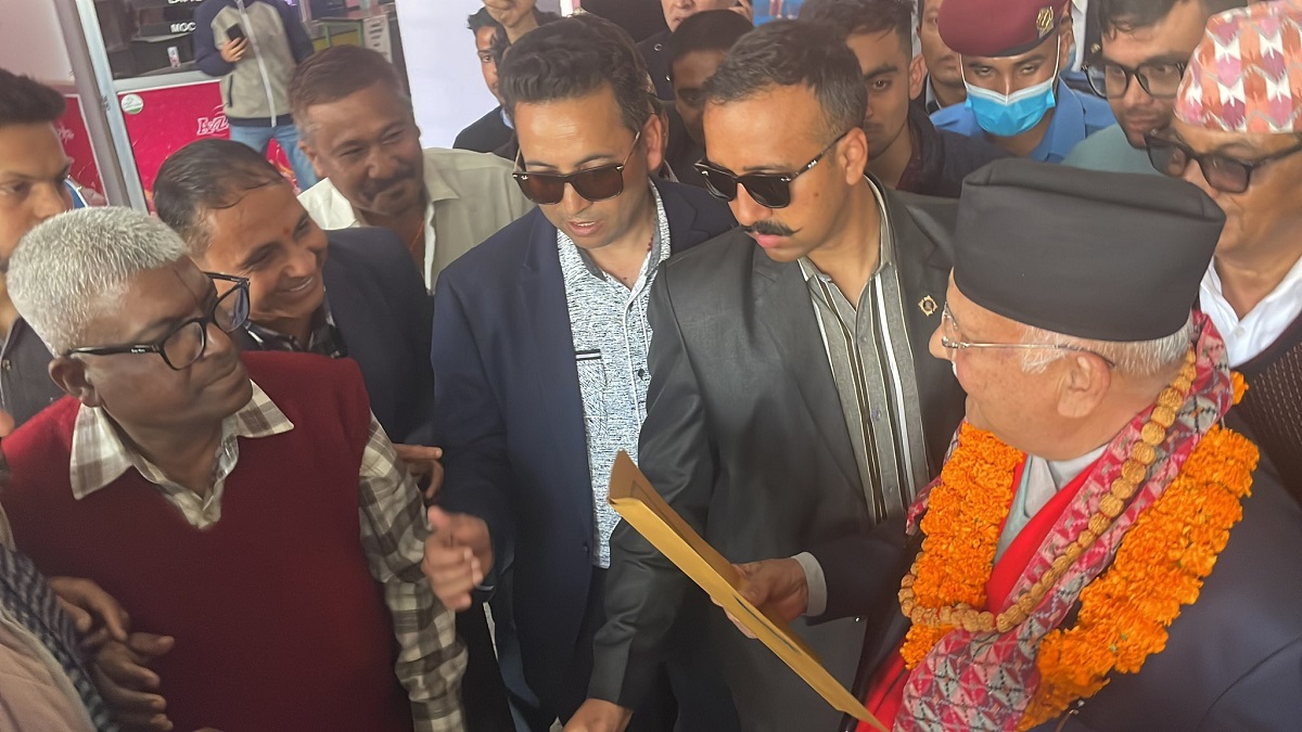 हेलिकप्टरबाट ओर्लिए लगत्तै ओलीलाई पत्र बुझाउँदै साहारा चितवन पीडित संघर्ष समितिका अध्यक्ष शालिग्राम दुवाडीले समस्या सुनाउन थाले।