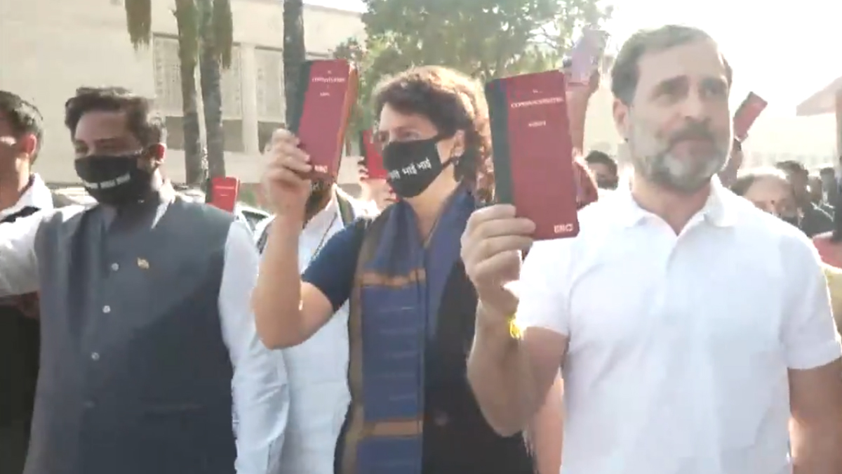 उनीहरूले अदानी प्रकरणमा खुलेका विषयहरूमाथि छानबिन गर्नका लागि संसदीय समिति बनाउन माग गरेका छन्। संसद भवनबाहिर उनीहरूले भारतको संविधान बोकेर प्रदर्शन गरेका थिए।