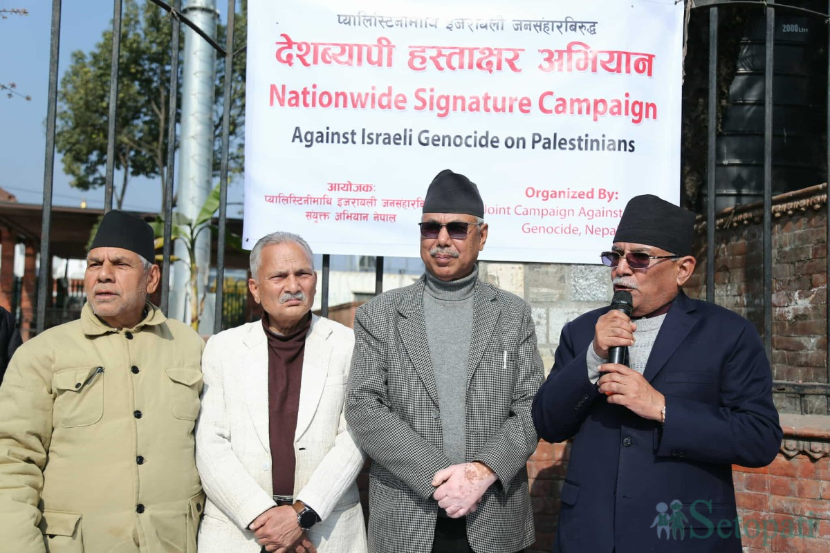 प्यालेस्टिनीमाथि इसराइली जनसंहारविरूद्ध संयुक्त अभियान नेपालले सोमबार काठमाडौंको माइतीघर मण्डलमा आयोजना गरेको हस्ताक्षर संकलन कार्यक्रममा नेकपा (माओवादी केन्द्र), नेकपा (एकीकृत समाजवादी), नेपाल समाजवादी पार्टी (नयाँ शक्ति) लगायत दलका थुप्रै नेताहरू उपस्थित भएका थिए।