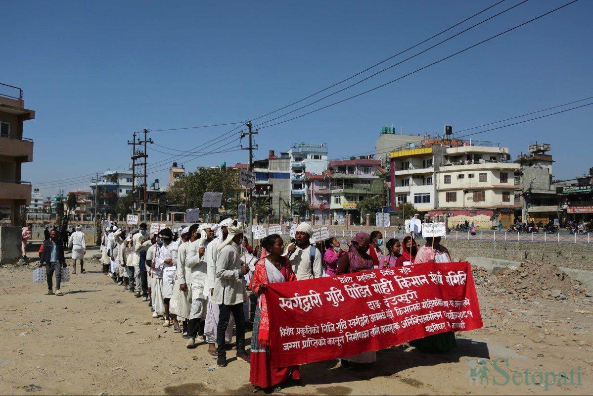 मोहियानी हकको माग राख्दै काठमाडौंकेन्द्रित आन्दोलन गर्दै आएका स्वर्गद्वारी गुठी पीडितहरूले नेकपा (एमाले) को केन्द्रीय कार्यालय च्यासलअघि धर्ना दिएका छन्।