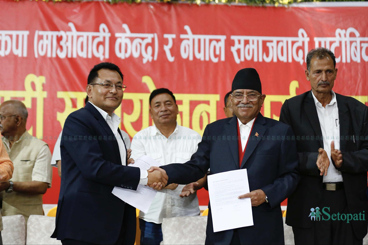सोमबार ललिपुरको ग्वार्को खरिबोटस्थित कान्तिपुर ब्यांक्वेटमा माओवादी केन्द्रका तर्फबाट अध्यक्ष पुष्पकमल दाहाल 'प्रचण्ड' र नेसपाका तर्फबाट सहध्यक्ष गंगानारायण श्रेष्ठले सहमति पत्रमा हस्ताक्षर गरेका हुन्।