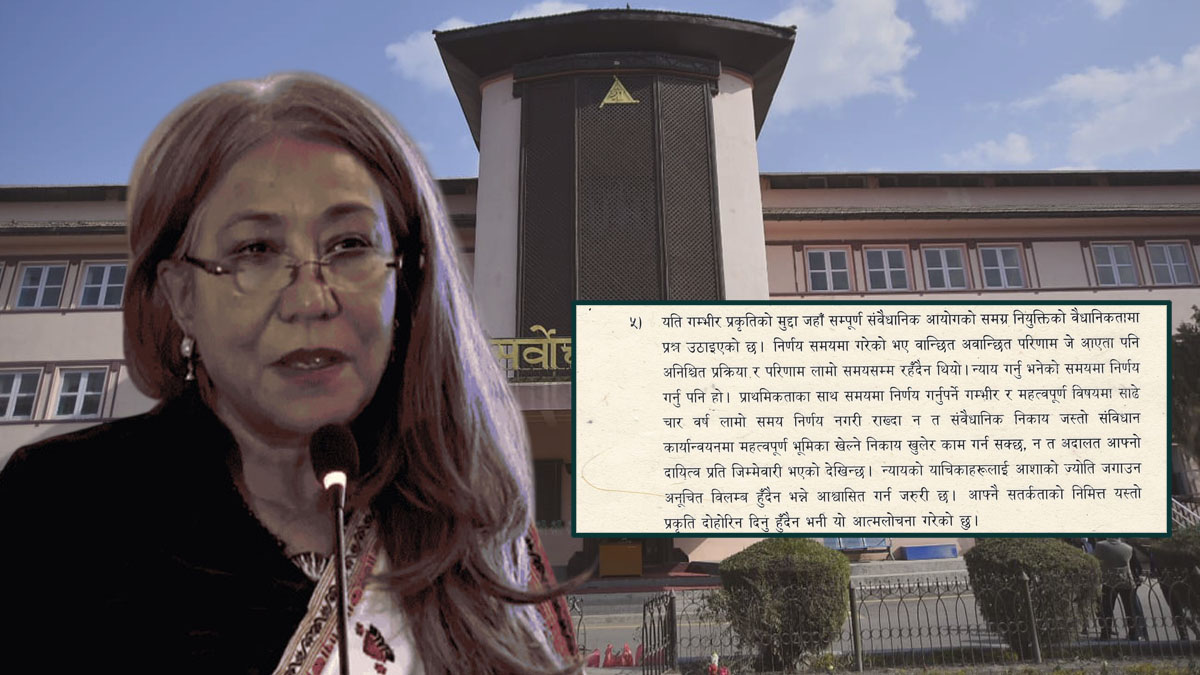 'न्याय गर्नु भनेको समयमा निर्णय गर्नु पनि हो। प्राथमिकताका साथ समयमा निर्णय गर्नुपर्ने गम्भीर र महत्वपूर्ण विषयमा साढे चार वर्ष लामो समय निर्णय नगरी राख्दा न त संवैधानिक निकाय जस्तो संविधान कार्यान्वयनमा महत्वपूर्ण भूमिका खेल्ने निकाय खुलेर काम गर्न सक्छ, न त अदालत आफ्नो दायित्व प्रति जिम्मेवारी भएको देखिन्छ । न्यायको याचिकाहरूलाई आशाको ज्योति जगाउन अनूचित विलम्ब हुँदैन भन्ने आश्वासित गर्न जरुरी छ । आफ्नै सतर्कताको निमित्त यस्तो प्रकृति दोहोरिन दिनु हुँदैन भनी यो आत्मलोचना गरेको छु,' रायमा न्यायाधीश मल्लले लेखेकी छन्।