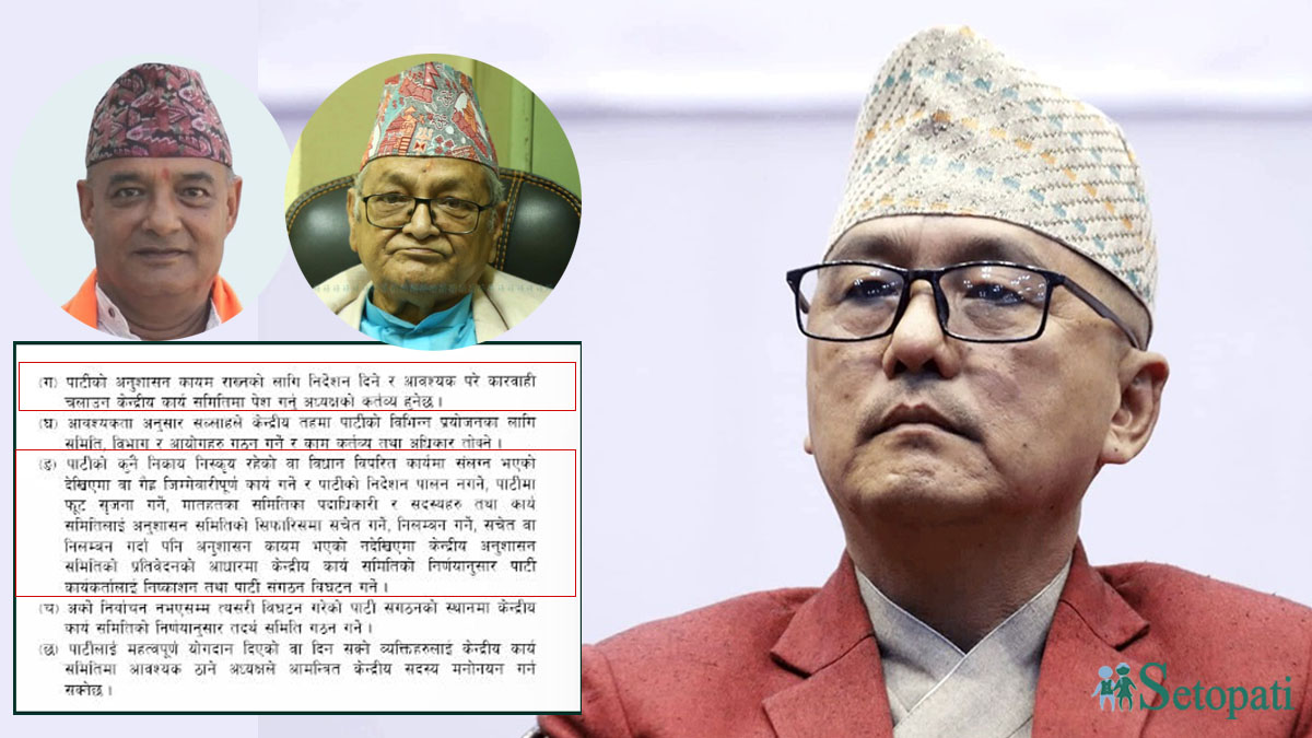 अध्यक्षको काम, कर्तव्य र अधिकारअन्तर्गत (ग) मा भनिएको छ- पार्टीको अनुशासन कायम राख्नका लागि निर्देशन दिने र आवश्यक परे कारबाही चलाउन केन्द्रीय कार्यसमितिमा पेस गर्नु अध्यक्षको कर्तव्य हुनेछ भन्ने उल्लेख छ। यसअनुसार अध्यक्ष लिङ्देनले असार २५ गते सुवेदी र लावतीलाई हटाउन केन्द्रीय समितिमा पेस गरेनन्, बरू एकलौटी निर्णय गरिदिए। यसैले असन्तुष्ट पक्षले लिङ्देनले विधानविपरीत कार्य गरे भनेका हुन्।