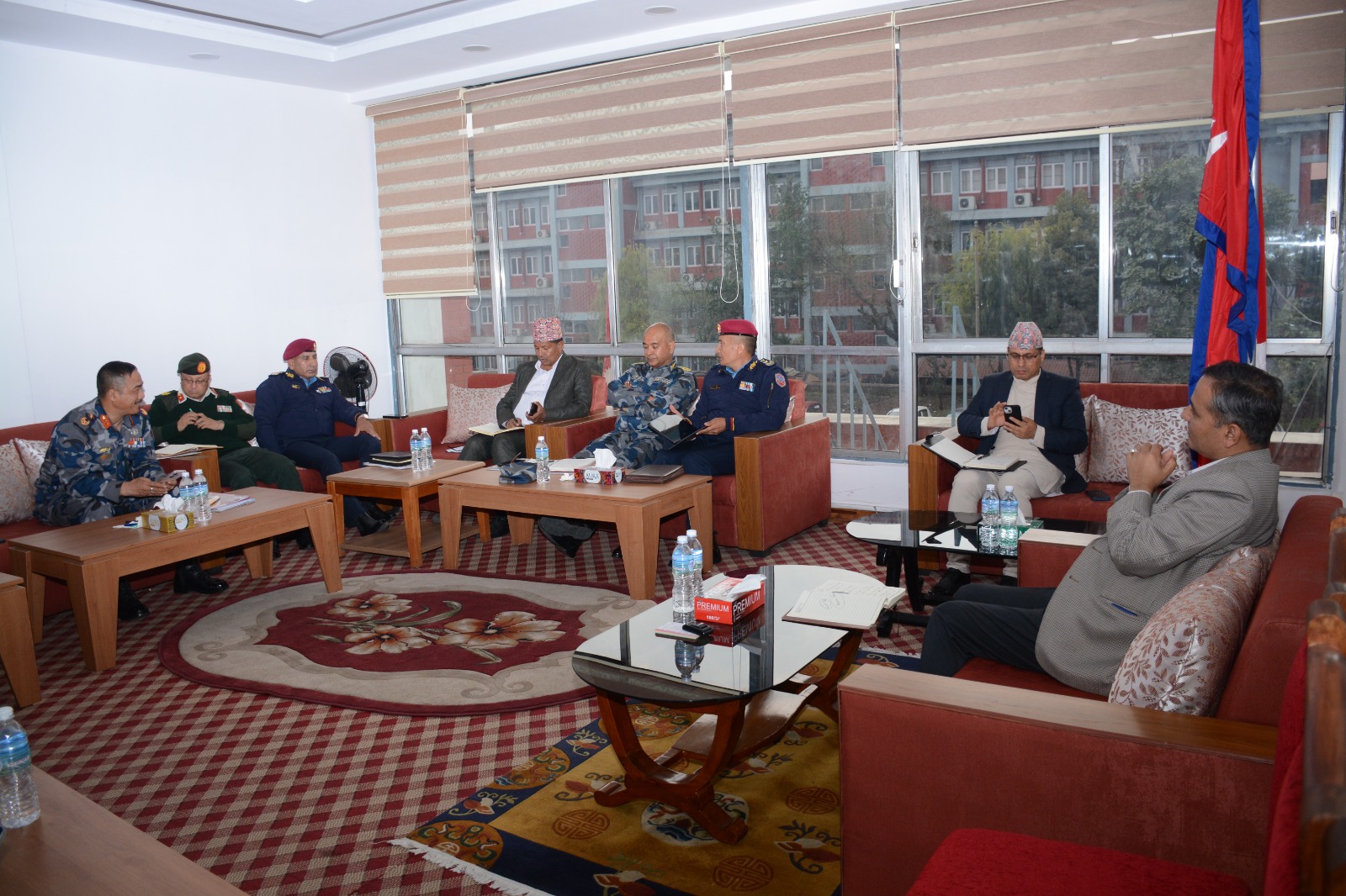 केन्द्रीय सुरक्षा समितिका अध्यक्ष एवं गृहमन्त्री ओमप्रकाश अर्यालको अध्यक्षतामा जारी बैठकमा चार वटै सुरक्षा निकायका उच्च पदाधिकारीहरूको उपस्थिति छ।