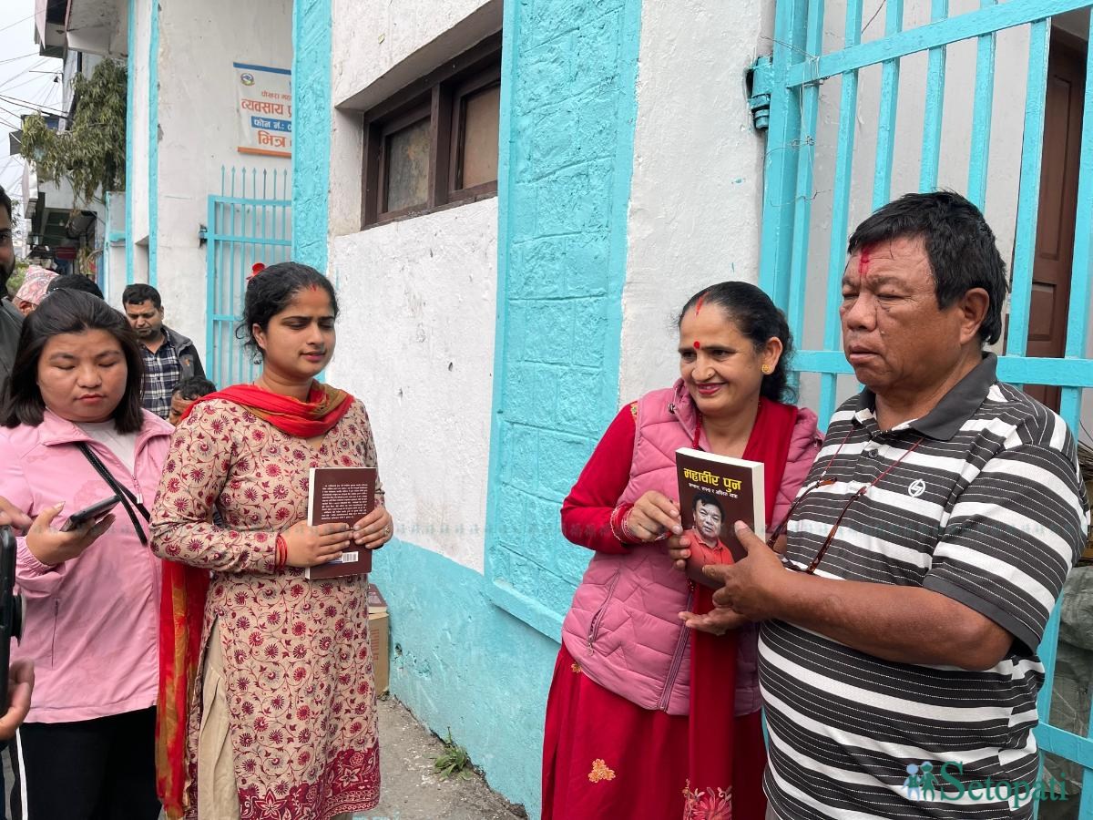 ‘बहिनीले काठमाडौंबाट फोन गरेर महावीर पुनको पुस्तक उनकै हस्ताक्षरमा किनेर पठाइदिन भनिन्, अनि म पुस्तक किन्न आएँ,’ उनले भने, ‘एउटा पुस्तक बहिनीका लागि, एउटा पुस्तक मेरा लागि भनेर दुई थान पुस्तक किनेँ।’
