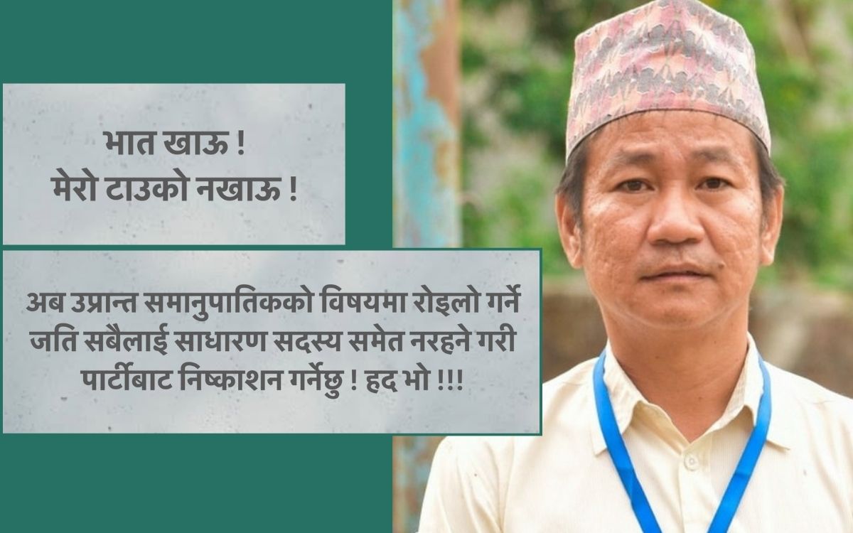 त्यसमा उनले भनेका छन्, 'अब उप्रान्त समानुपातिकको विषयमा रोइलो गर्ने जति सबैलाई साधारण सदस्य समेत नरहने गरी पार्टीबाट निस्कासन गर्नेछु! हद भो!!!'