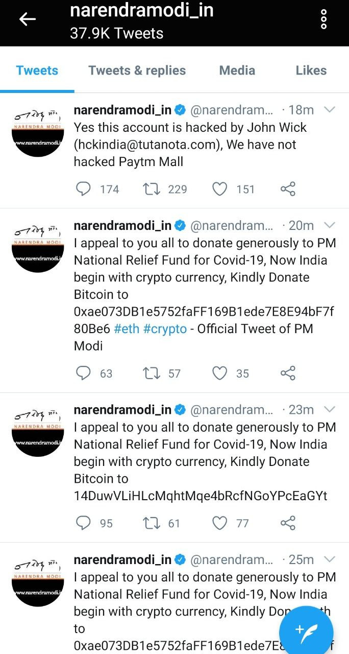 Tweets appeared urging followers to make donations to 'PM National Relief Fund for COVID-19' through cryptocurrency. The @narendramodi_in handle is the third handle of Modi apart from @narendramodi and @PMOIndia.