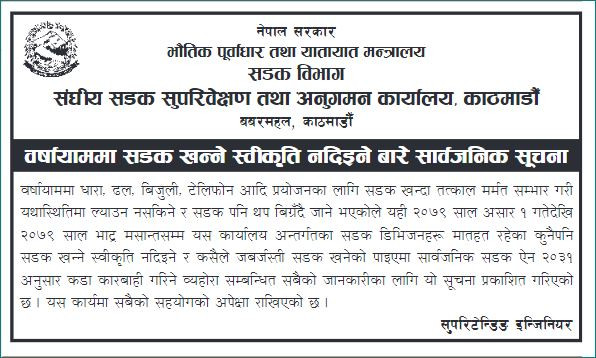 The Department of Roads has prohibited digging of roads for the next three months during the monsoon season.