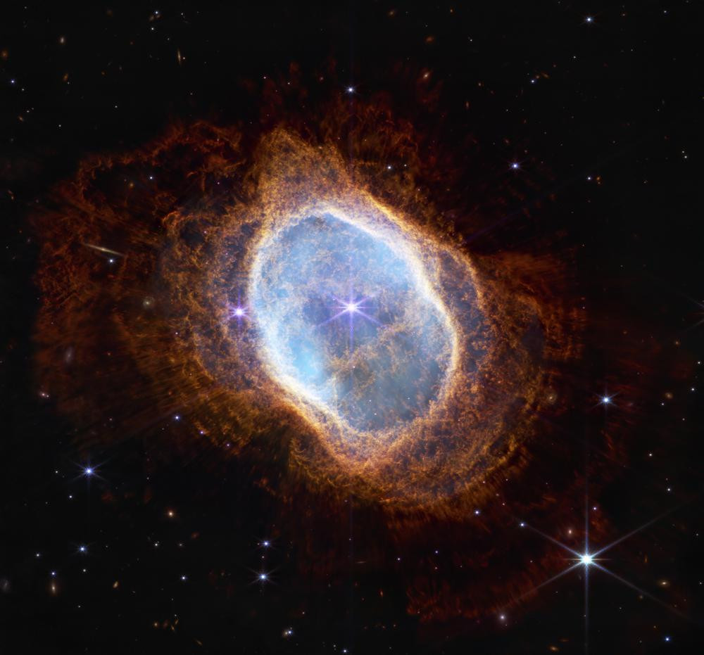 — Southern Ring nebula, which is sometimes called “eight-burst.” Images show a dying star with a foamy edge of escaping gas. It’s about 2,500 light-years away. A light-year is 5.8 trillion miles. “This is the end for this star, but the beginning for other stars,” Pontoppidan said. As it dies, it throws off parts that seed the galaxy with elements used for new stars, he said.