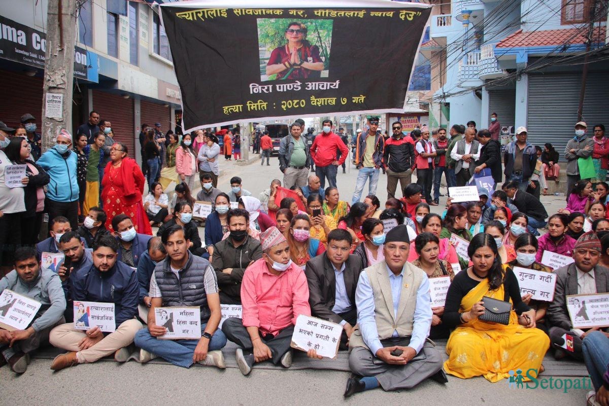 काठमाडौंको कपन सरस्वतीनगरकी निरा आचार्यको हत्यामा अभियुक्तलाई पत्ता लगाउन माग गर्दै स्थानीयले प्रदर्शन गरेका छन्।