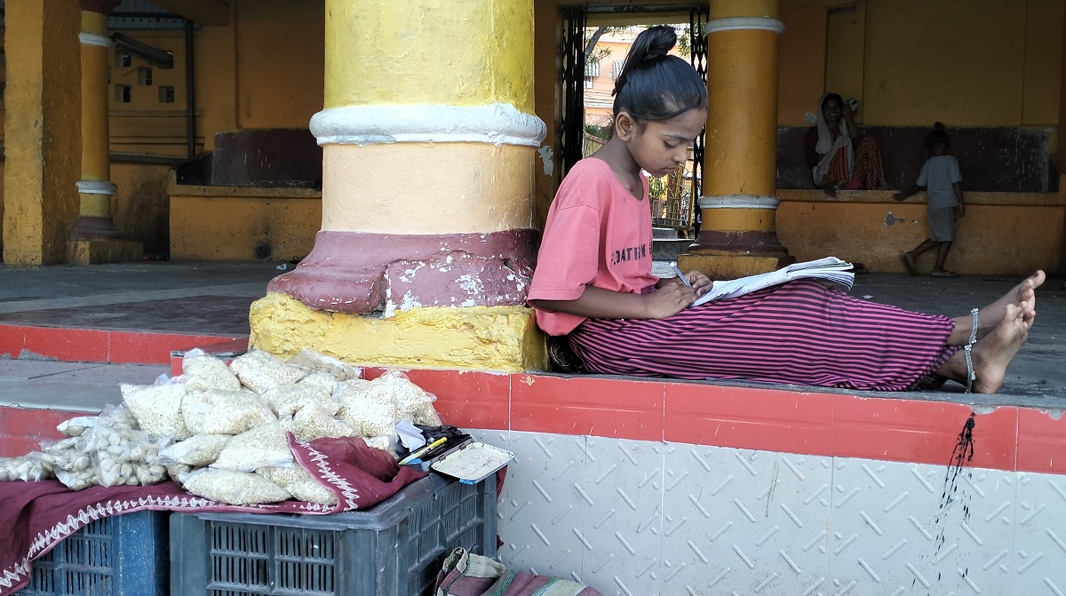 आडैको बरन्डामा उनी दुइटा क्रेटको टेबलजस्तो बनाउँछिन्। त्यहाँमाथि सल ओछ्याउँछिन्। झोलामा ल्याएको मुरही र सोयाबिन (न्युटेला) का साना बीस/पच्चीस वटा प्याकेट निकाल्छिन्। किताबकापी र पुरानो ज्यामिति बक्स पनि फिँजाउँछिन्। अनि ग्राहक कुर्दै उनी आफ्नो गृहकार्य गर्न थाल्छिन्।