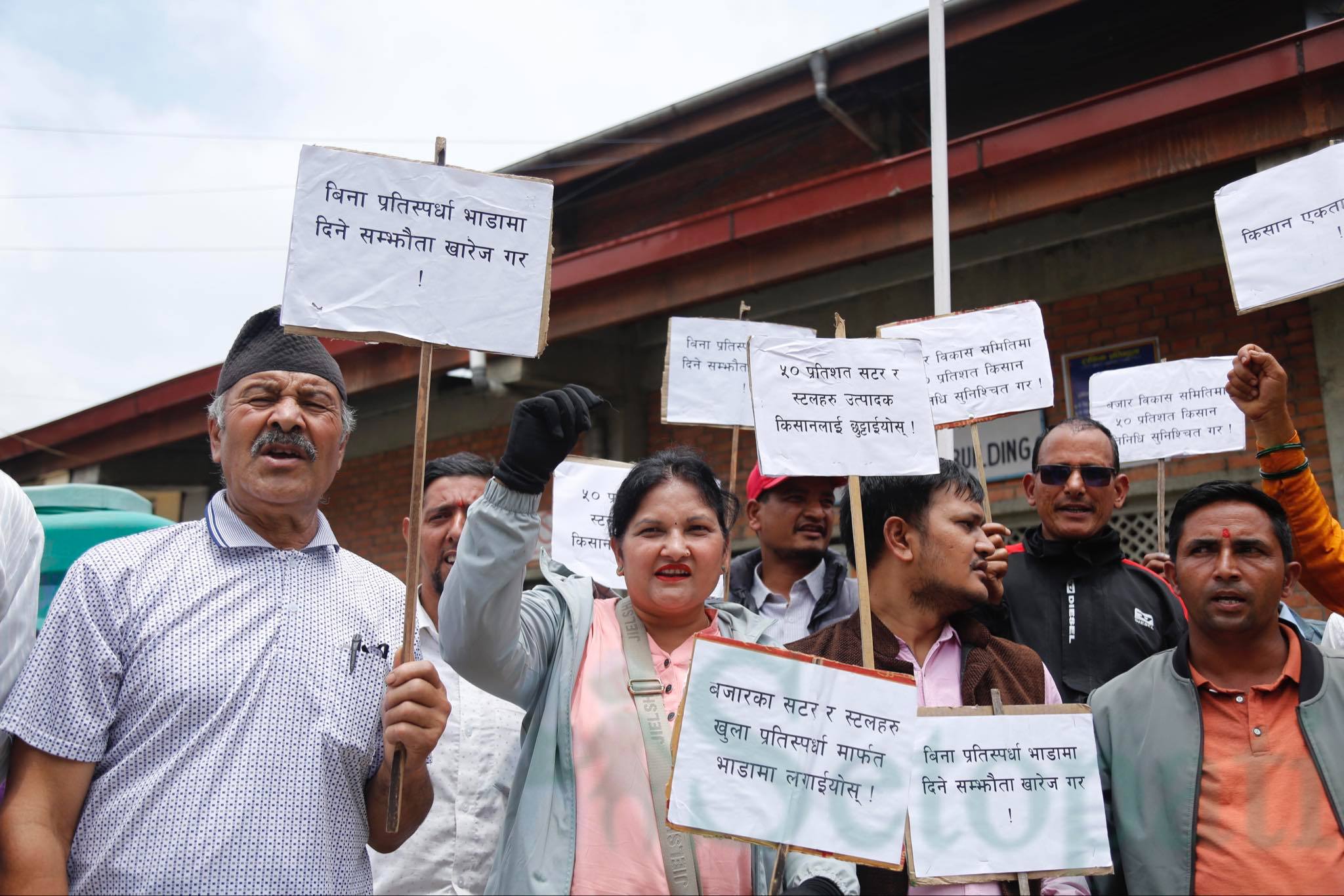 कालीमाटी तरकारी तथा फलफूल बजारका सटरहरू बिनाप्रतिस्पर्धा भाडामा सम्झौता दिन लागिएको भन्दै राष्ट्रिय किसान सञ्जालले शुक्रबार पनि धर्ना दिएको छ।