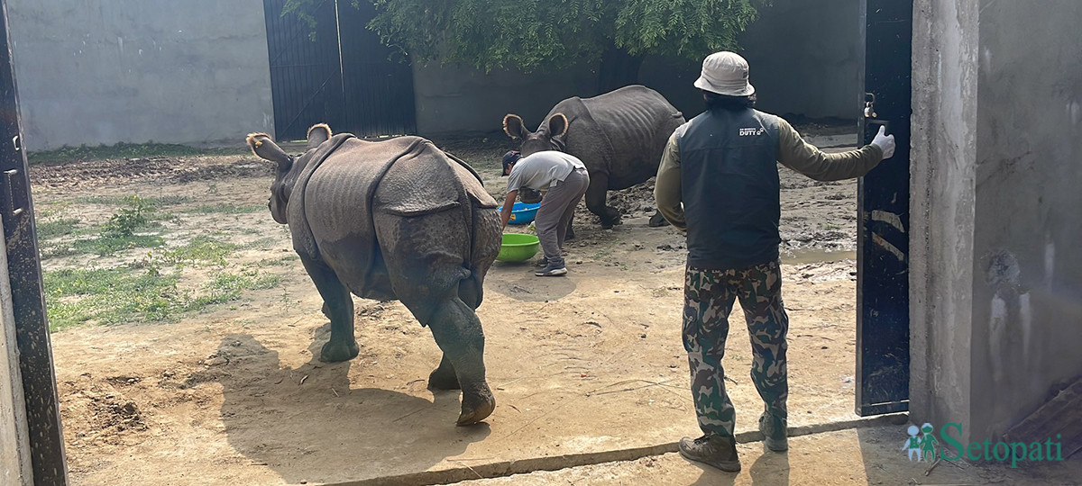 ती गैंडाहरूलाई हरेक दिन बिहान इन्क्लोजरबाट खुला ठाउँमा छाड्न थालिएको राष्ट्रिय प्रकृति संरक्षण कोष जैविक विविधता संरक्षण केन्द्र सौराहाकी प्रमुख रचना शाहले बताइन्।