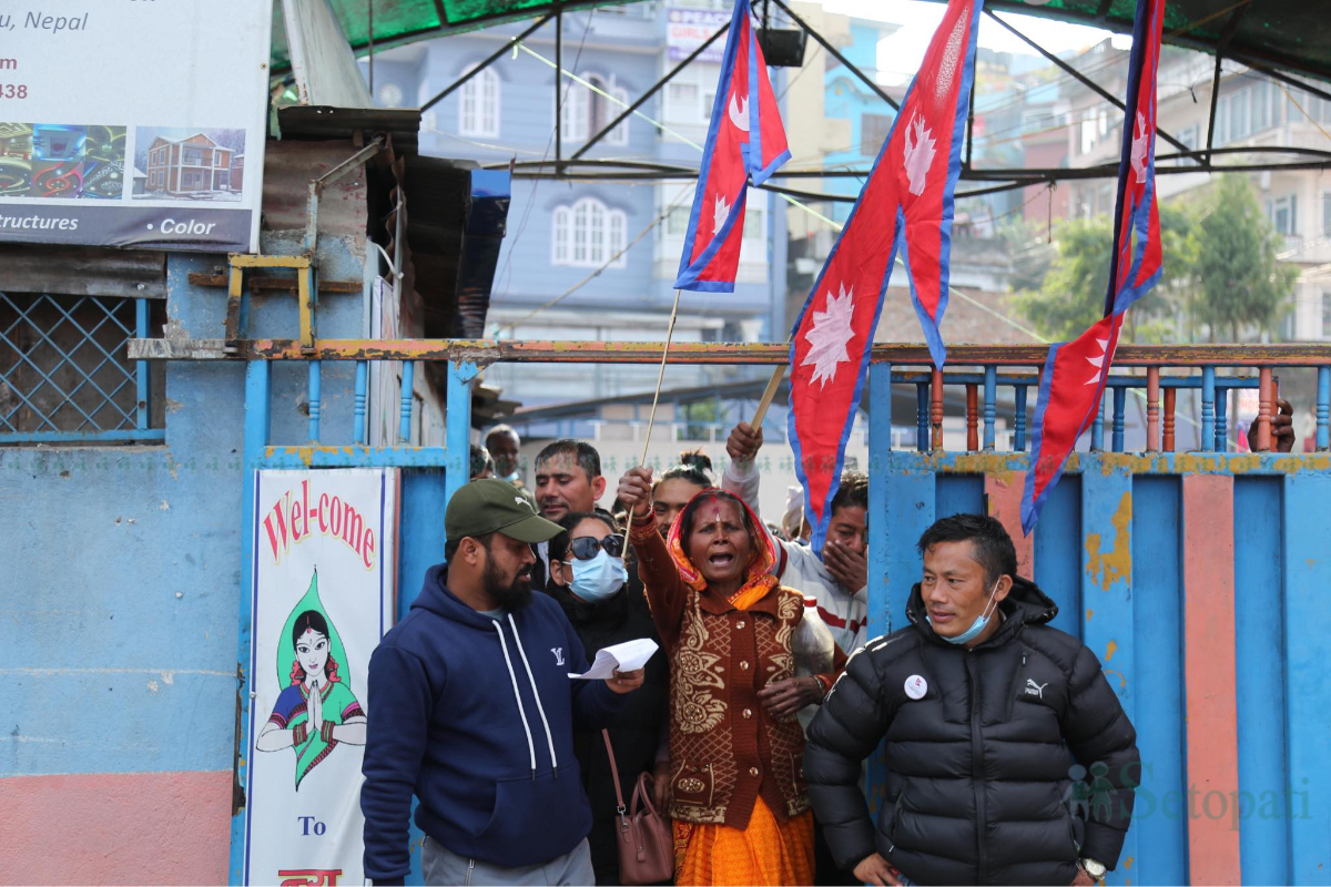 उनीहरू नेपालको झण्डा बोकेर भित्र बसेर नाराबाजी गरिरहेका हुन्। प्रदर्शनकारीलाई प्रहरीले बाहिरबाट घेरा लगाएको छ।