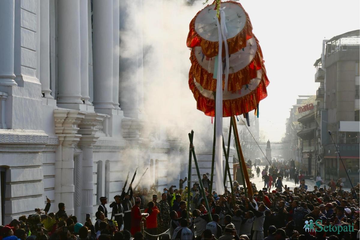 काठमाडौंको हनुमानढोकास्थित बसन्तपुरमा होलीको चीर ठड्याइएको छ।