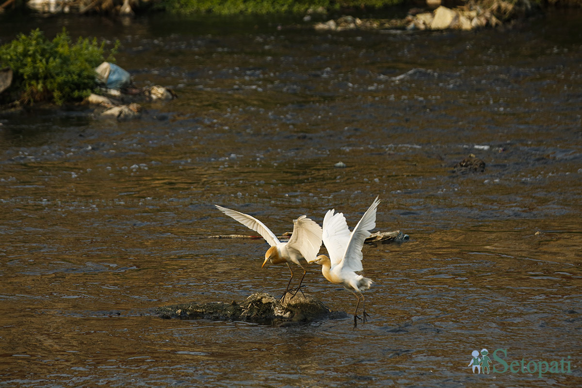 थापाथली नजिकको बागमती नदीमा एक हुल बकुल्ला आहारा खोजिरहेका देखिन्छन्।
