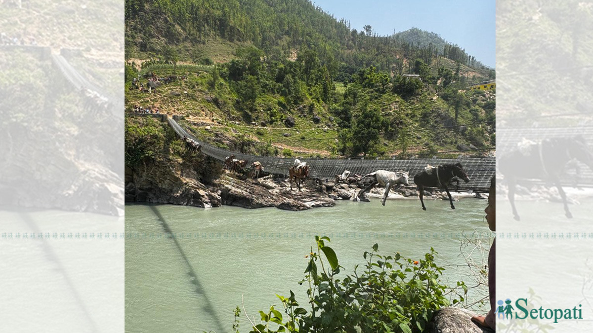कर्णाली नदीमाथिको झोलुंगे पुलमा फसेका १३ मध्ये दुई वटा खच्चड मरेका छन्।