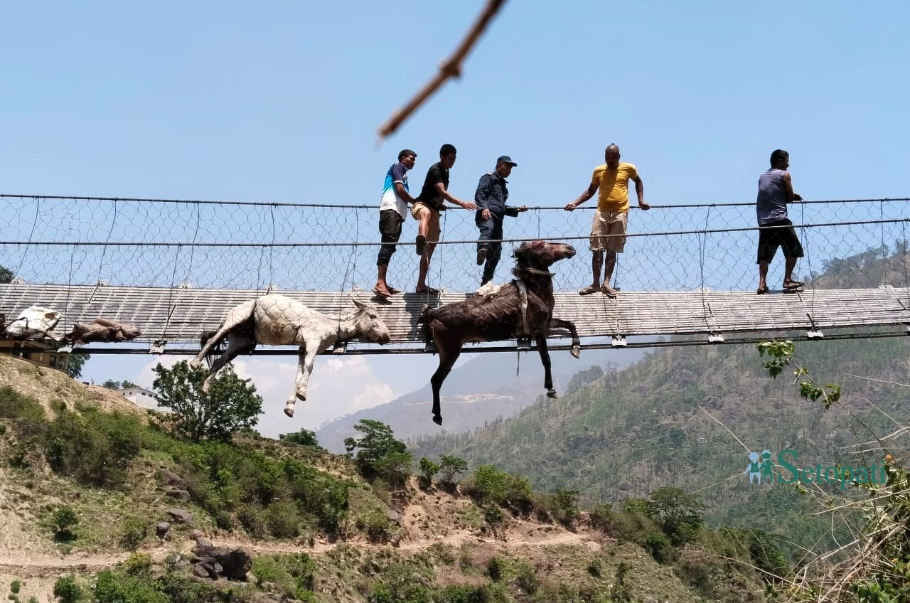 खच्चड पुलको जालीमा अड्केको देखेपछि नवीन अघि बढ्न सकेनन्।