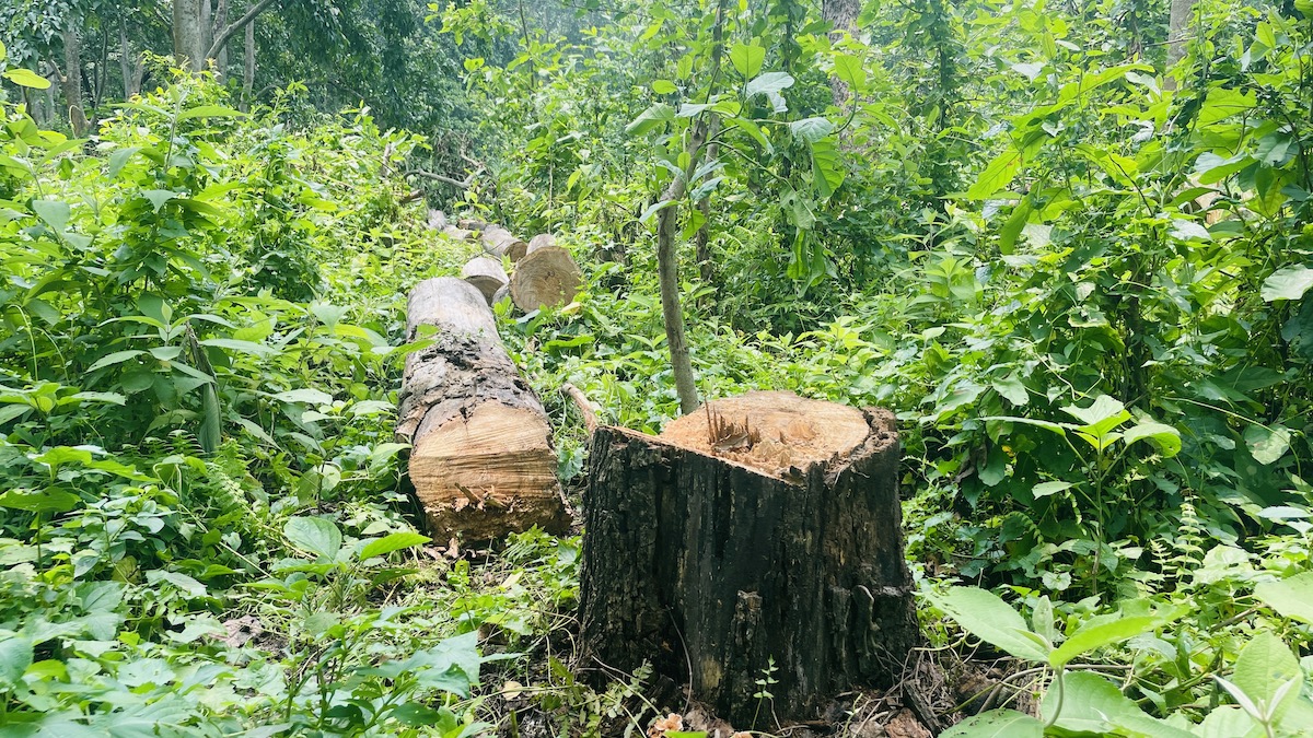 हामी पुग्दा सामुदायिक वनमा काटिएका रूख र काठका गोलियाहरू असरल्ल थिए।