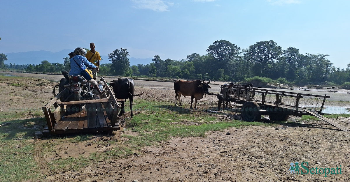 'यस्तो दुख गर्न त केही रहर थिएन। मान्छेलाई बर्खामा दु:ख हुन्छ, मसँग भएको यही डल्लब मान्छेलाई सहज होला भनेर चलाउँछु। पुल नभएकाले यी राँगा र हामी मान्छे सबैलाई दुख भएको छ।'