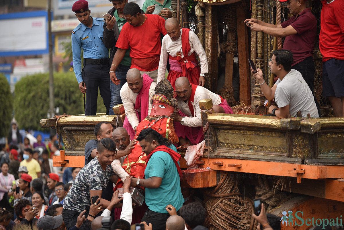 भोटो देखाएपछि रातो मच्छिन्द्रनाथ अर्थात् बुंगद्य: लाई रथबाट ओरालिँदै। फाइल तस्बिर: नारायण महर्जन/सेतोपाटी