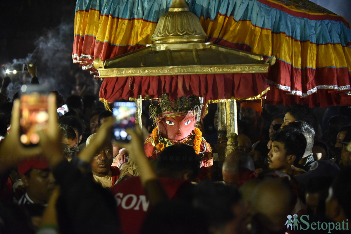 रातो मच्छिन्द्रनाथलाई खटमा हालेर बुंगमती लगिँदै। तस्बिर: नारायण महर्जन/सेतोपाटी