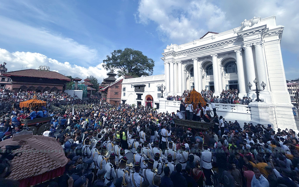 आजको दिन मुख्य रूपमा मनाइने इन्द्रजात्रा पर्वमा राष्ट्रपतिबाट हनुमानढोकास्थित गद्दी बैठकमा जीवित देवीका रूपमा रहेका श्री गणेश, श्री भैरव र श्री कुमारीको रथयात्रा नजर गर्ने परम्परा छ। इन्द्रध्वजाको लिङ्गो ठड्याएपछि सुरु भएको जात्राभरि भक्कुनाच, महाकालीनाच, लाखेनाच, दशअवतार तथा देवराज इन्द्रको वाहन ऐरावत हात्तीको प्रतिकका रूपमा पुलुकिसी नाच नचाउने गरिन्छ।