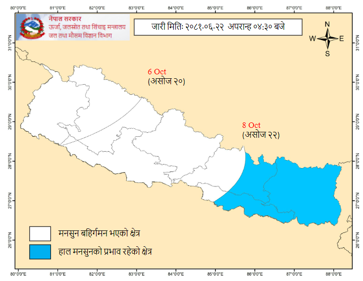 सुदूरपश्चिम प्रदेशलगायत कर्णाली प्रदेशका धेरै तथा लुम्बिनी प्रदेशको पश्चिमी भू–भागको थोरै स्थानहरूबाट गत असोज २० नै मनसुन बाहिरिएको थियो।
