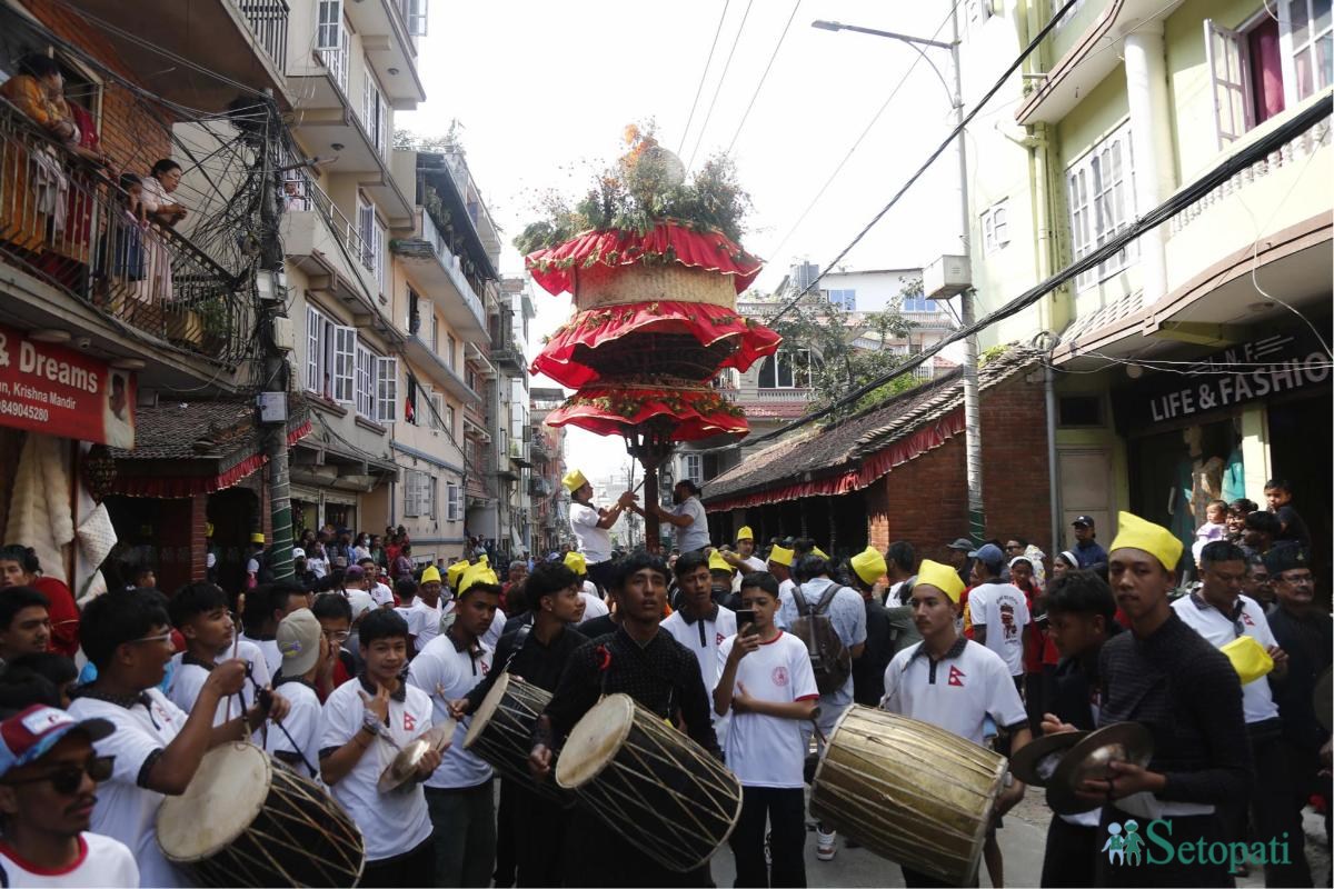 यो जात्रामा तीन वटा रथ हुन्छन्। गजुरमुनि र रथमाथि देवता (ईश्वर नारायण) राखिएको हुन्छ। अरू जात्राहरूमा रथमा माथिल्लो भागमा गजुर हुन्छ।
