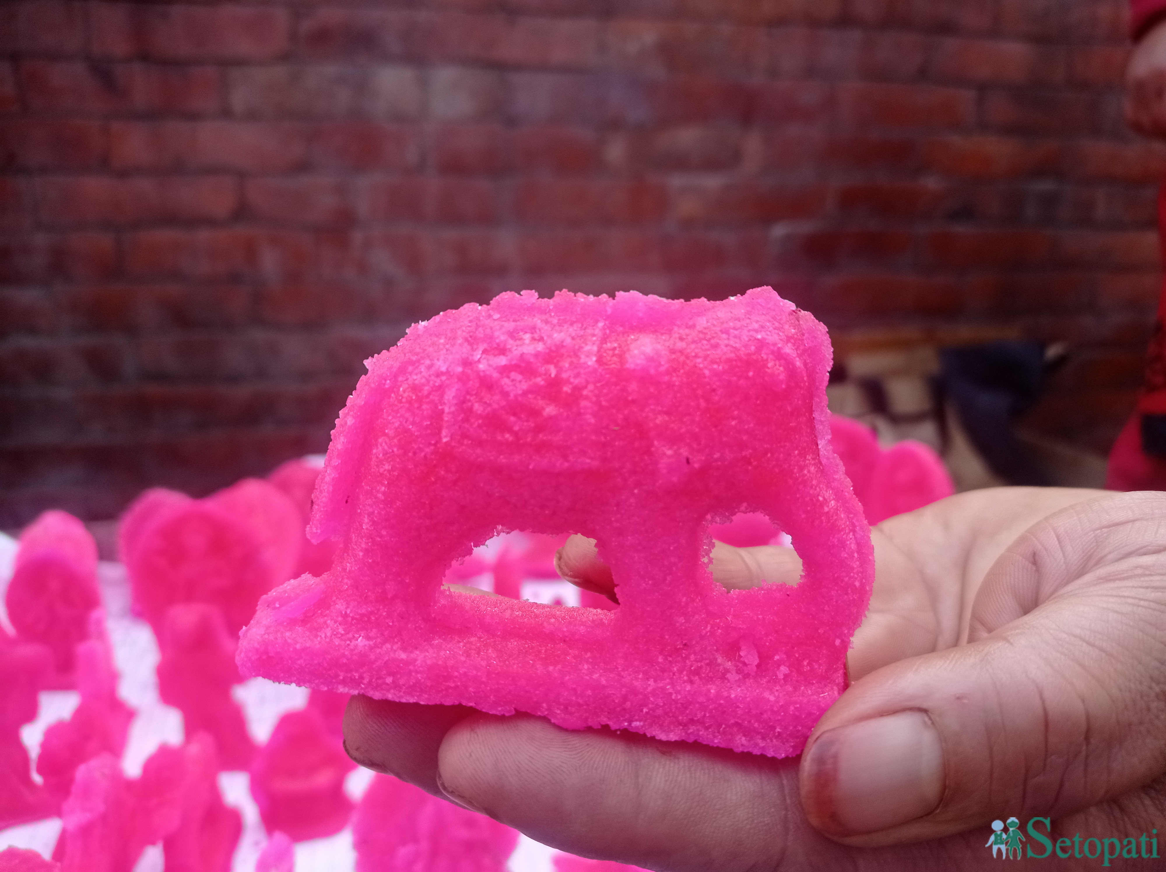 उनीहरूसँग यसरी मिठाइको आकार दिने थासा करिब ५०-६० वटा छन्। चिनी पग्लिएर जाने सामग्री भएकाले तिहारका लागि चाहिने यो मिठाइ धेरै अगाडिबाट बनाउन मिल्दैन। उनीहरू करिब १०-१५ दिन अघिबाट मात्र बनाउन थाल्छन्।