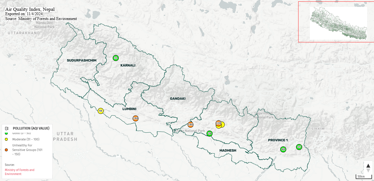 अहिले बिहान ८ः३४ बजे मापन गरिएको सूचकांकअनुसार भरतपुरको एक्युआई १४५.८१ र काठमाडौंको रत्नपार्कको १३९.१७ छ।