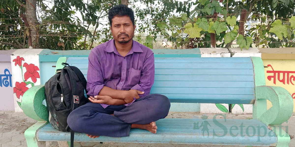 धनगढीको रंगशाला नजिकै शहिद गेटदेखि क्याम्पचोक जाने सडकको छेउमा रहेको बेञ्च बसिरहेका छन् एक पुरुष। साथमा एउटा सानो र थोत्रो कालो रंगको झोला छ। खुट्टामा थोत्रा चप्पल लगाएका छन्। सर्ट, पाइन्ट पनि मैलो छ।