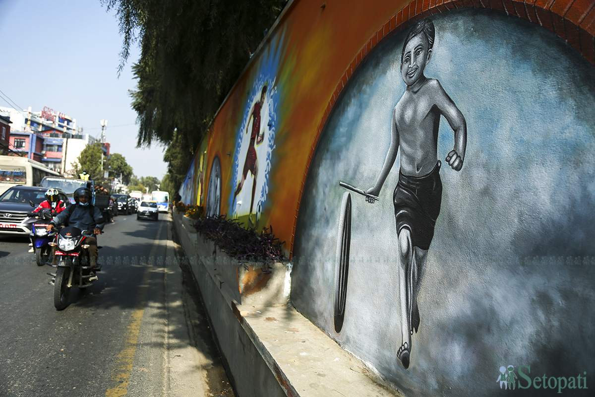 काठमाडौं महानगरपालिकाको आर्थिक सहयोग तथा ललितकला प्रज्ञा प्रतिष्ठानको समन्वयमा कलाकारहरूले रंगशालाको सडकपेटीको भित्तामा चित्र कोरेका हुन्।