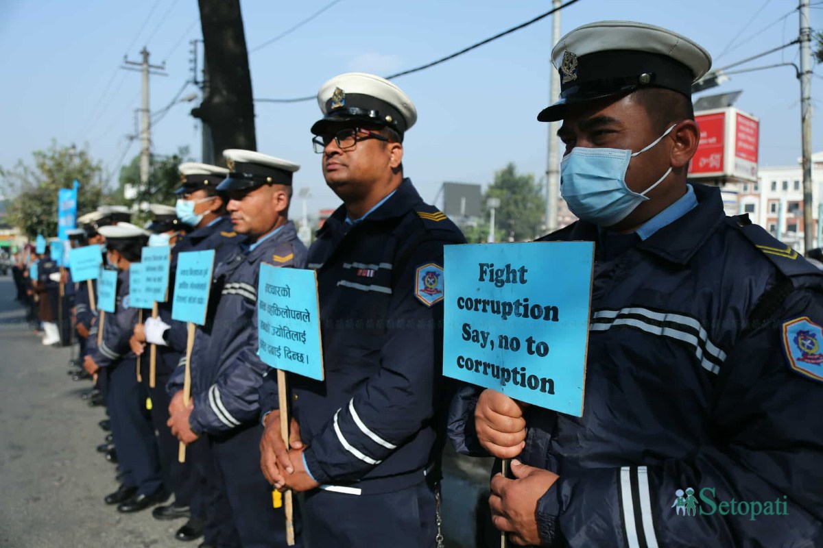 ट्रान्सपरेन्सी इन्टरनेशनलको आयोजनामा जनपद प्रहरी र ट्राफिक प्रहरीहरू प्लेकार्ड बोकेर प्रदर्शन गरेका हुन्।