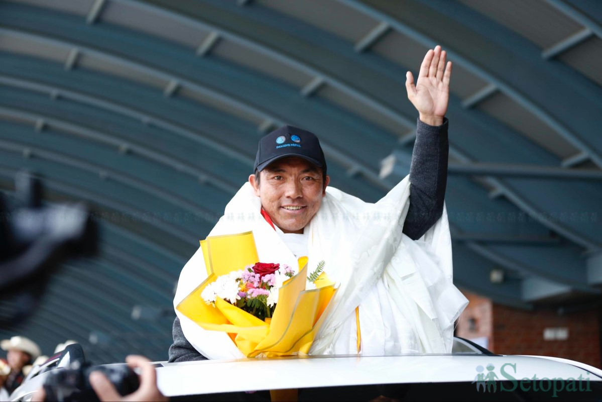 कीर्तिमानी पर्वतारोही तथा माउन्टेन गाइड मिङ्मा ग्याल्जे शेर्पालाई काठमाडौंस्थित त्रिभुवन अन्तर्राष्ट्रिय विमानस्थलमा भव्य स्वागत गरिएको छ।