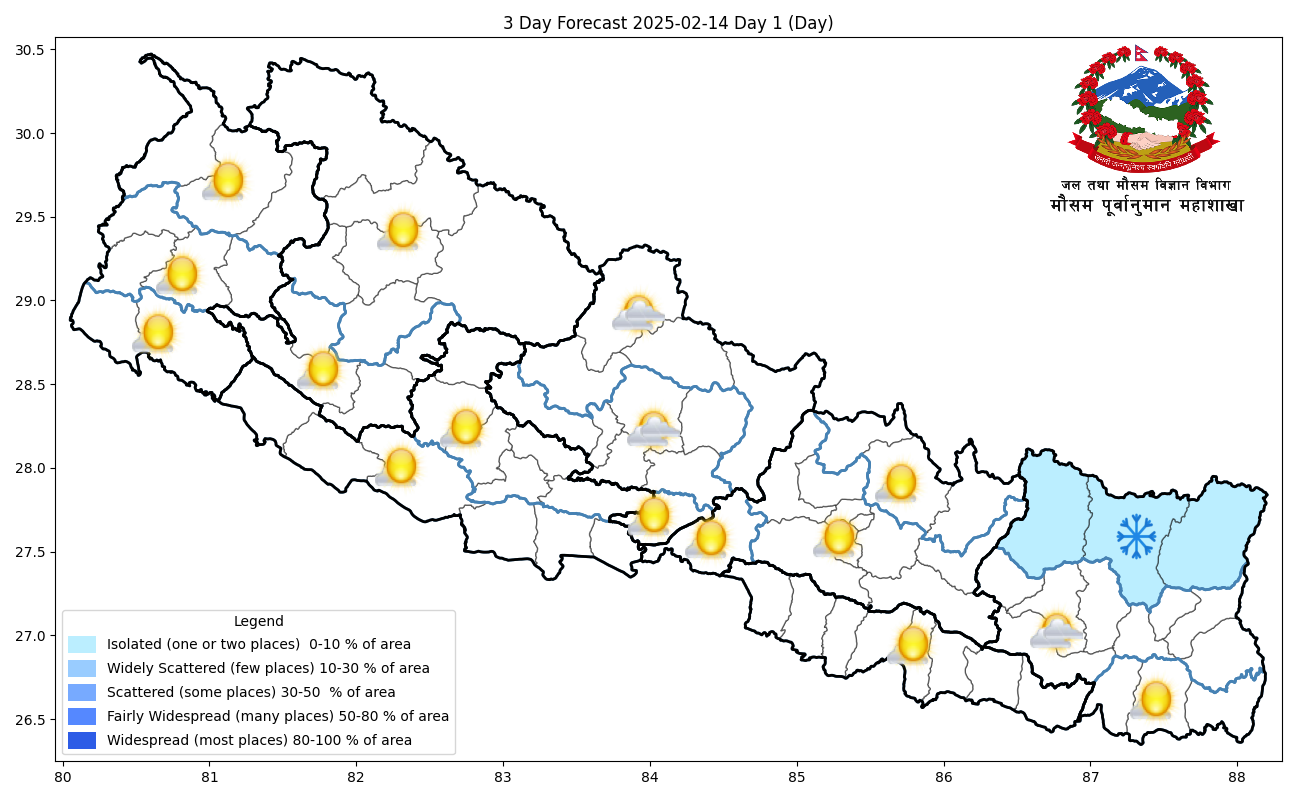 शुक्रबार कोशी प्रदेशको उच्च पहाडी तथा हिमाली भू–भागका एक–दुई स्थानमा हल्का हिमपातको सम्भावना रहेको छ। बिहानीपख तराईका केही भू–भागहरुमा हुस्सु/कुहिरो लाग्ने पनि महाशाखाले बताएको छ।