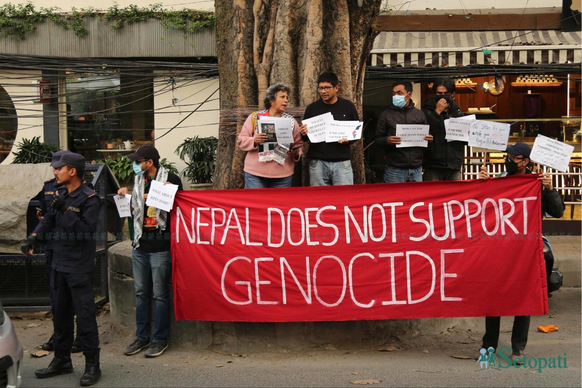 बुधबार काठमाडौंको बालुवाटारमा मानवअधिकार अभियन्ताहरूले प्यालेस्टाइनको पक्षमा प्रदर्शन गरेका हुन्।