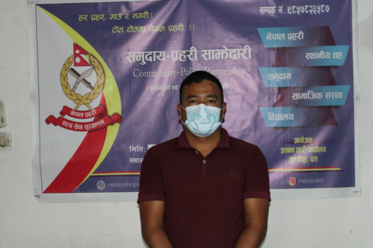तुलसीपुर उपमहानगरपालिका वडा नम्बर १२ पुकार पसलनजिकै घर भएका ४२ वर्षीय वीरबहादुर गुरुङ पक्राउ परेको इलाका प्रहरी कार्यालय तुलसीपुरका प्रहरी प्रवक्ता प्रहरी निरीक्षक सूर्य राना मगरले बताए।