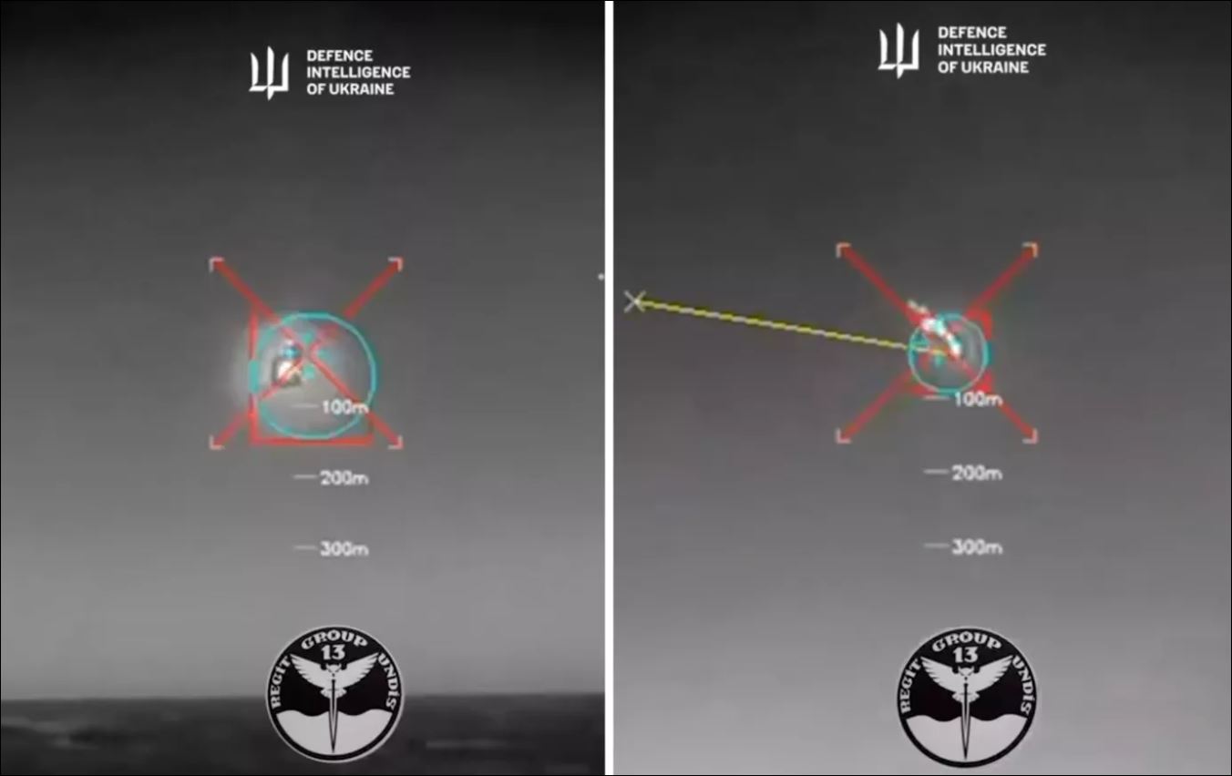 युक्रेनको सैन्य गुप्तचर निकाय एचयुआरले पोस्ट गरेको अस्थिर क्यामेराले खिचेको एउटा भिडियोमा टाढा समुद्रमाथि एक वस्तुमा आगो लागेर बिस्फोट भएको देखिन्छ। त्यसपछि क्यामेरा घुम्छ र त्यो वस्तु समुद्रमा खस्दै गरेको देखिन्छ।