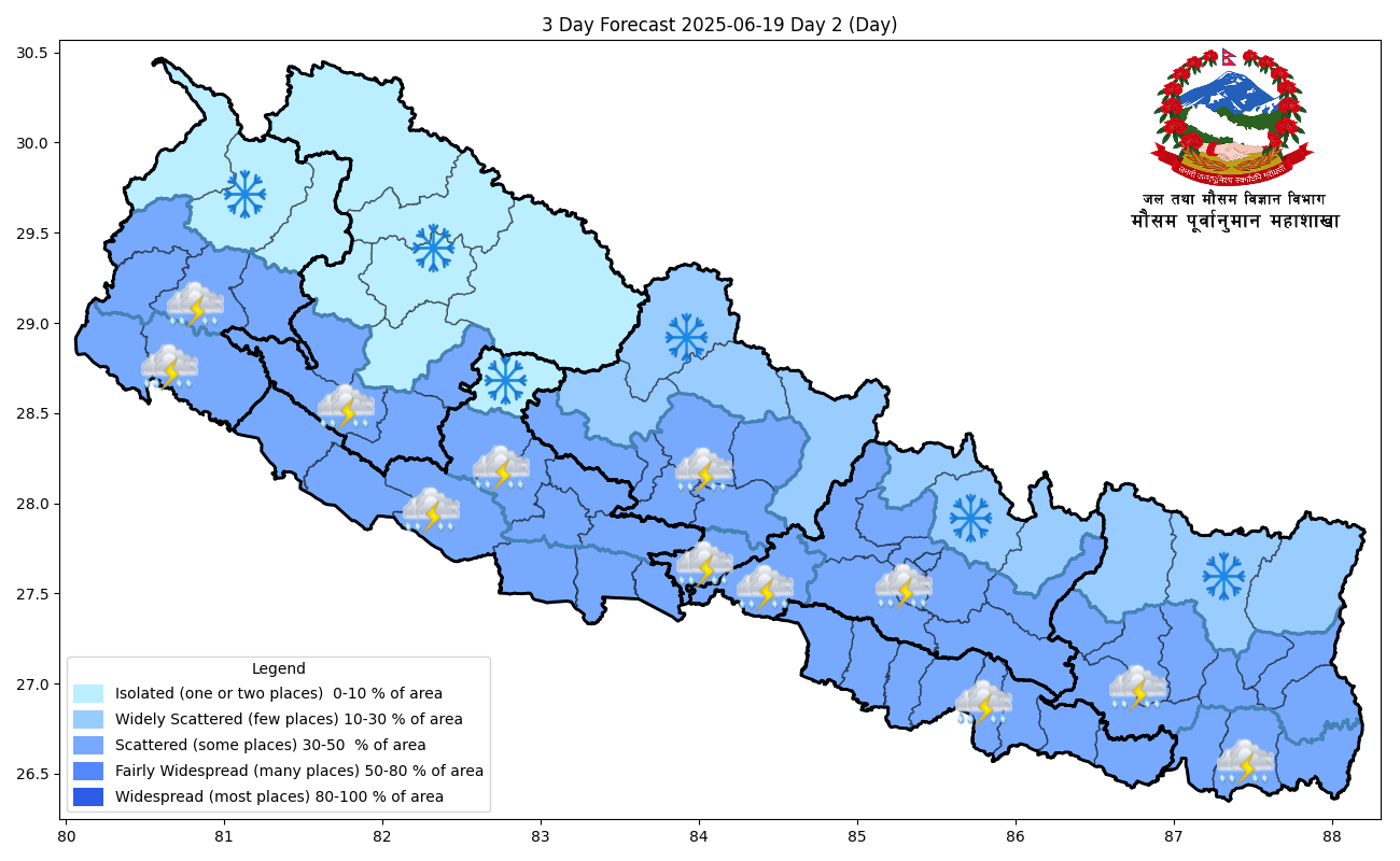 भू–उपग्रह तथा मौसम प्रारूपहरूबाट प्राप्त तथ्यांक तथा सूचनाको हालको विश्लेषणका आधारमा सिन्धुपाल्चोक र सोको माथिल्लो जलाधार क्षेत्रमा हाल मनसुनको प्रभाव भए पनि कमजोर अवस्थामा रहेकोले हल्कादेखि मध्यम वर्षा हुन सक्ने सम्भावना रहेको विभागले जनाएको छ।