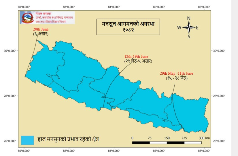 ‘यस वर्षको मनसुन प्रणाली शुक्रबार (जेठ ६) गते (सन् २०२५ जुन २० तारिख) का दिन देशभ फैलिएको छ। नेपालमा यस वर्षको मनसुन जेठ १५ गते ( सन् २०२५ मे २९ तारिख ) देशको पूर्वी भू–भागबाट प्रवेश गरी कोशी प्रदेशको अधिकांश भू–भागमा विस्तार भएकोमा मिति २०८२/०२/२९ गते (सन् २०२५ जुन १२ तारिख) मधेस प्रदेश, बागमती प्रदेश, गण्डकी प्रदेशका केही भू–भाग र लुम्बिनी प्रदेशका पूर्वी क्षेत्रका थोरै भू–भाग सम्म विस्तार भएको थियो,’ विभागले बुलेटिनमार्फत् भनेको छ।