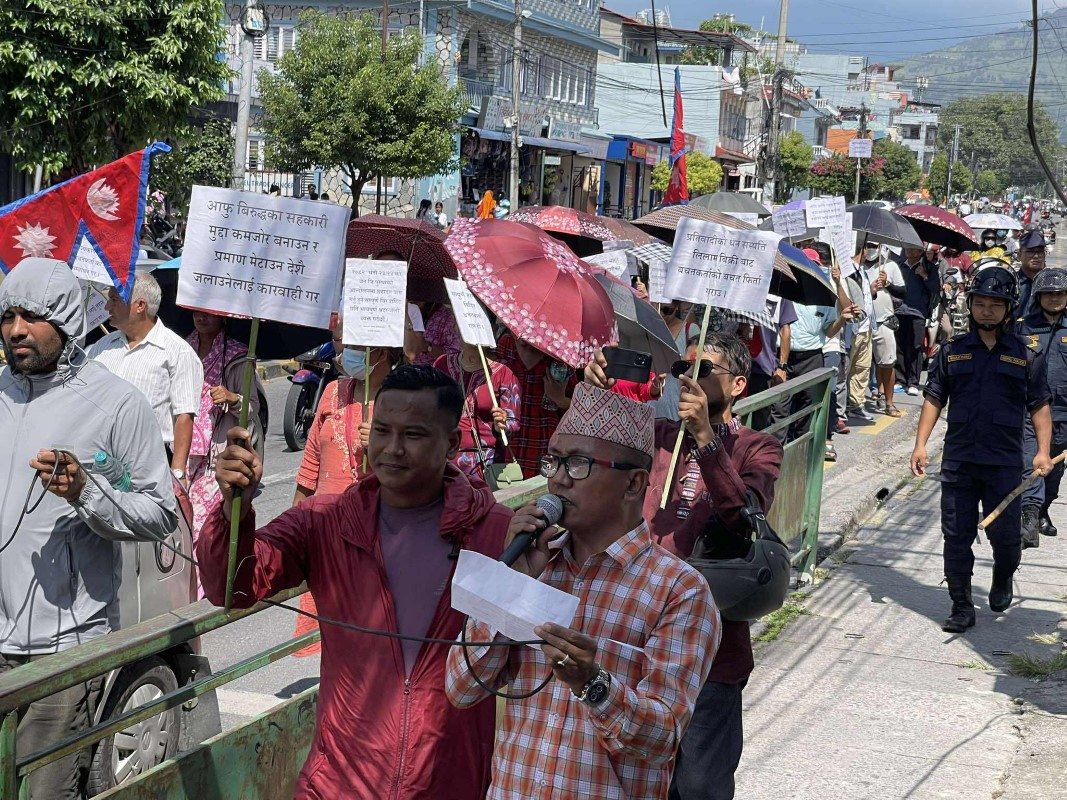 पीडितले पोखराको पृथ्वीचोकबाट निकालेको विरोध जुलुस सहिदचोक पुगेको छ।